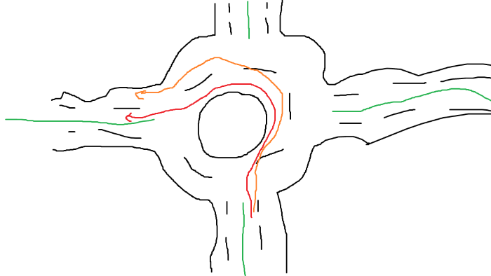 Mam taką zagwózdkę. Jak lepiej na egzaminie jak lepiej na egzaminie poruszać się na rondzie ? Niedługo ide na kurs na c i c+e a wiadomo to nie osobówka. Załózmy rondo 2 pasmowe i wszystkie wloty i wyloty z niego też 2 pasmowe bez oznaczonych poziomych kierunków . Skręcam w lewo, więc zajmuję lewy pas wjeżdżam na rondo na wewnętrzny i na przedostatnim zjeździe zaczynam zmieniać pas na rondzie na prawy i wyjeżdżam w prawy pas, czy z wewnętrznego od razu zjeżdżam na lewy pas jezdni po wyjeździe z ronda, oczywiście ustępując pierszeństwa na zewnętrznym pasie na rondzie ? Jak lepiej jest to zrobić ? Tak jak czerwona linnia czy pomarańczowa? Czy oba nie będą błędem ?