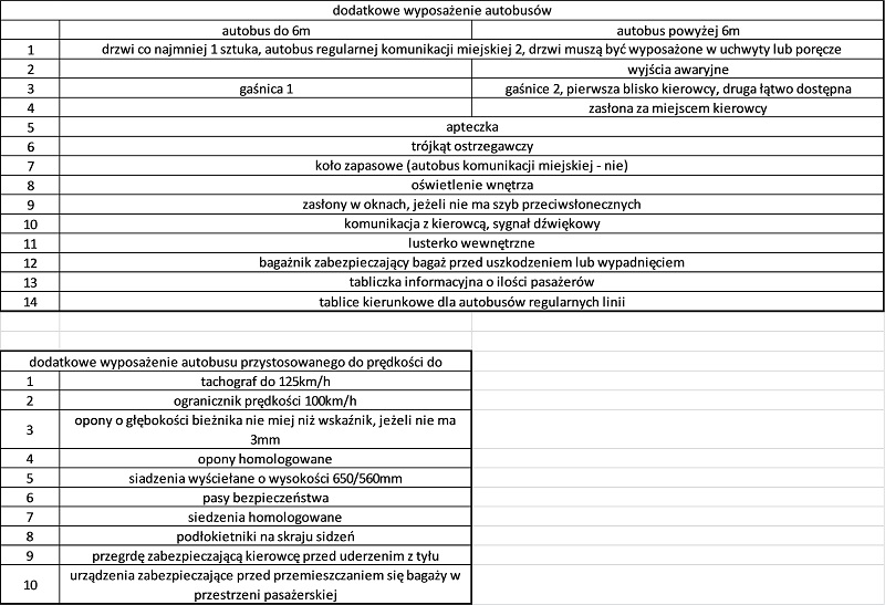 podczas egzaminu kat. D po sprawdzeniu jednego ze świateł i jednego z płynów, masz wymienić warunki dodatkowe dla autobusów wg rozporządzenia w sprawie warunków technicznych: