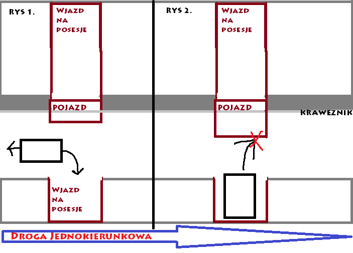 Witam. Mam pytanie, które nurtuje mnie od dawna: rzeczą naturalną jest jeżeli mamy drogę 1-kierunkową to na posesję wjeżdżam przodem a wyjeżdżam tyłem (rys 1.), a co jeżeli zechciałbym wjechać tyłem a wyjechać przodem(rys 2.) czy w takiej sytuacji samochód (rys 2.), który uniemożliwia mi wyjazd powinien odjechać, a co jeżeli ten drugi pojazd stoi przy wjeździe na własną posesje. Bo w sumie wyjeżdżam z posesji (art.46), czy zawsze powinno się wjeżdżać jak na (rys 1.)
