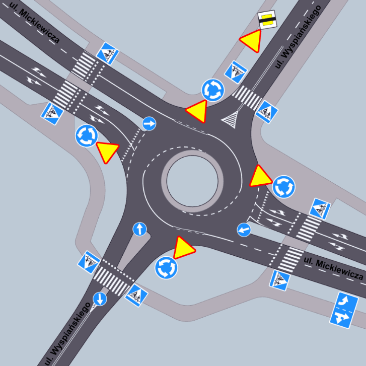 Na takich skrzyżowaniach o ruchu okrężnym nie wyznacza się pasów ruchu.