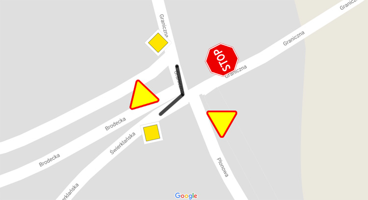 Ulica Graniczna + Świerklańska mają pierwszeństwo przejazdu ustanowione znakami (zaznaczone czarną kreską na rysunku)