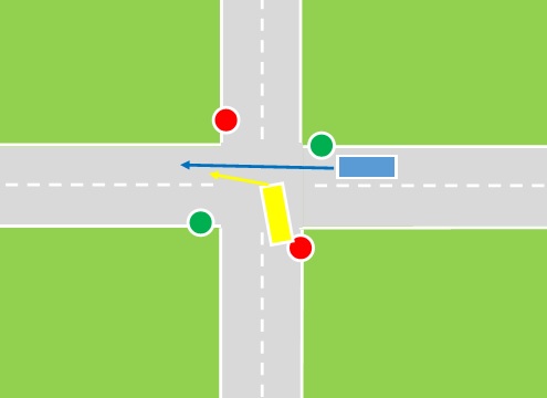 Ludzie oczywiście już niecierpliwi, kierowca uruchamia silnik, rusza. Z drogi poprzecznej, na której aktualnie jest światło zielone, jedzie drugi kierowca (w kierunku na wprost, czyli w kierunku docelowym pierwszego pojazdu) który pakuje się na skrzyżowanie - bo ma zielone, nie zważając na samochód znajdujący się na środku, który chce zjechać.