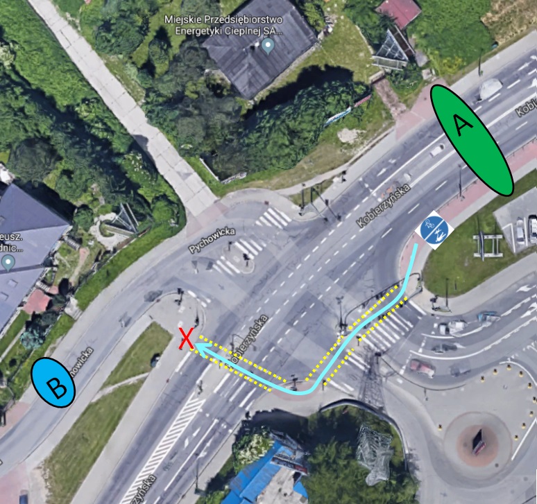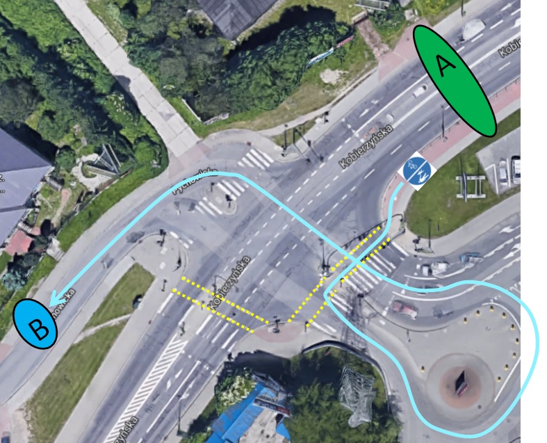 W sumie wydaje mi się najsensowniejsza. Nie trzeba robić żadnych dziwnych manewrów. Nie wpadam nagle na chodnik po którym nie mogę jechać. Wygląda też na w pełni zgodną z prawem. Jedynie troszkę naokoło, ale i tak na przełączenie się świateł na zielone trzeba chwilę poczekać.
