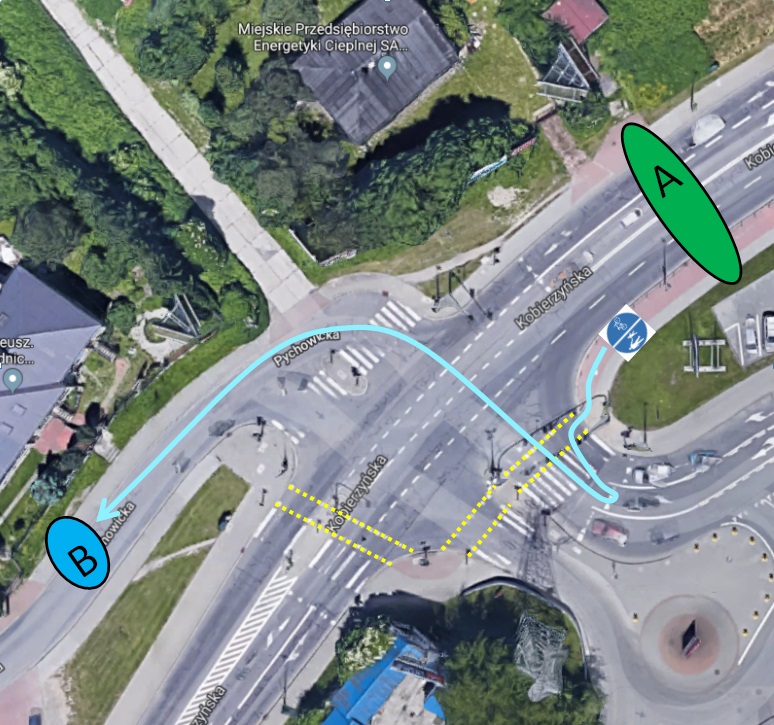 4. A może mając zielone światło na pierwszym przejeździe dla rowerów mogę bezpośrednio skręcić w prawo w Pychowicką ustępując pierwszeństwa samochodom na drodze. Moim zdaniem zbyt niebezpieczne.