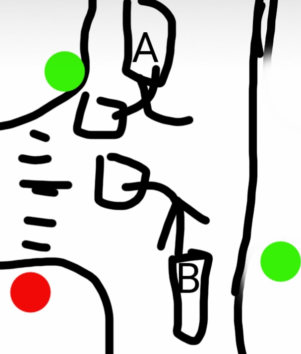 Sytuacja jak na rysunku. Samochody A i B zatrzymuja sie przed przejsciem, piesi przechodza i kto ma pierwszenstwo? Z kolega mamy dwie oddzielne teorie.