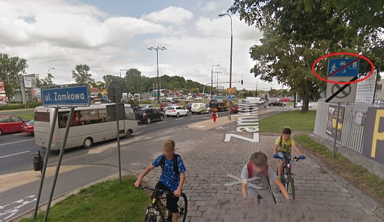 Mamy w takim razie dwa buble w oznakowaniu. Niekompletne oznakowanie strefy zamieszkania oraz tabliczkę z napisem "Dotyczy także niepełnosprawnych" pod znakiem B-1 (powinna być "Dotyczy także" + symbol osób niepełnosprawnych).