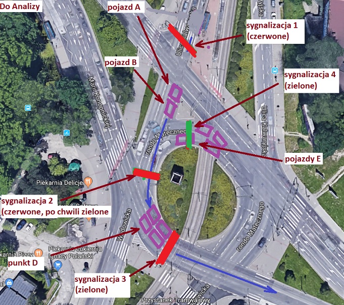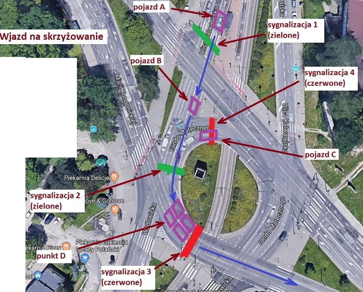 Jesteśmy na rondzie Matecznego w Krakowie. Jest to rondo tylko z nazwy (brak oznakowania C-12). Jedziemy od ulicy Kalwaryjskiej skrajnym lewym pasem (pas ten przeznaczony jest do jazdy na wprost i skrętu w lewo) i chcemy skręcić w lewo (pojazd A). Przed nami pojazd B właśnie minął sygnalizator 1, również chce skręcić w lewo. Wjeżdżamy na skrzyżowanie. Nagle pojazd B się zatrzymuje w miejscu wskazanym na obrazku. Możliwe, że uznał iż w punkcie D nie ma dla niego miejsca, możliwe, że chciał przepuścić pojazd C, który nie zdążył przejechać na swoim zielonym świetle, ale zdążył wjechać "pod semafor", nie wiemy. Sygnalizacja 2 zmienia się na czerwone, sygnalizacja 4 zmienia się na zielone.
