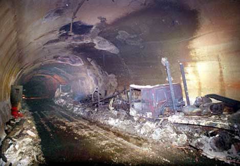 zniszczenia po pożarze w tunelu pod przełęczą Św. Gotarda (ponad 18 km), widać jak palił się beton - temperatura ponad 1000 stopni.