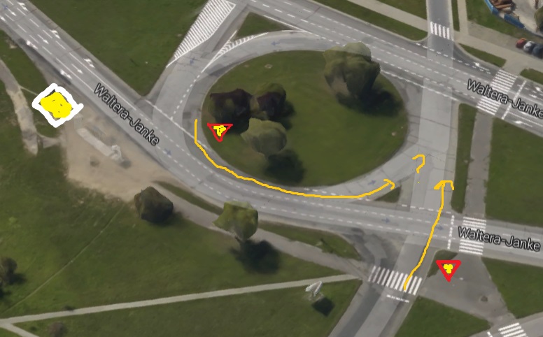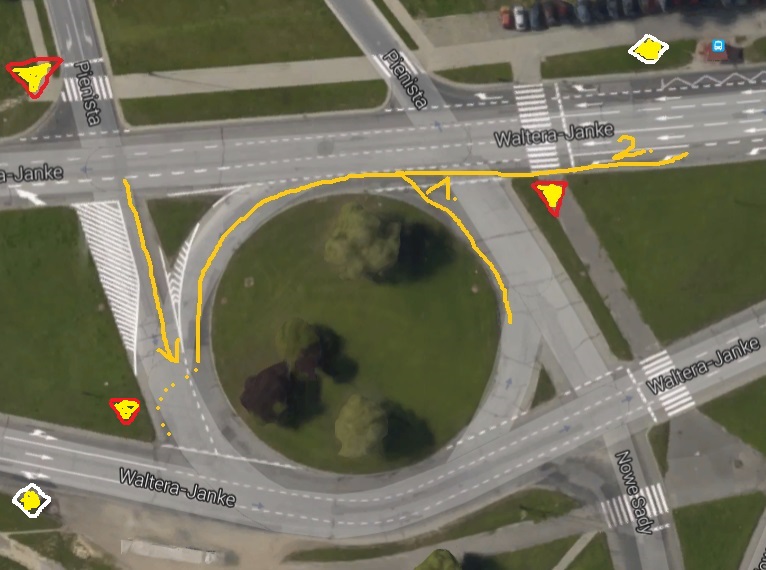 Czy Jadąc trasą nr 2 byłbym na drodze z pierwszeństwem cały czas aż do momentu dojechania do styku Waltera-Janke Pienista (pierwszeństwo również przy zmianie pasa)? Jak to się ma to trasy nr 1.