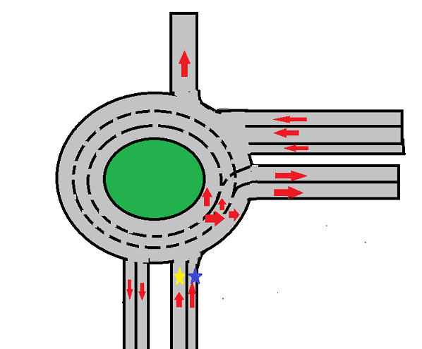 Istotne jest oznaczenie przed wjazdem - strzałki poziome na pasach dochodzących do ronda , znaki F-10.