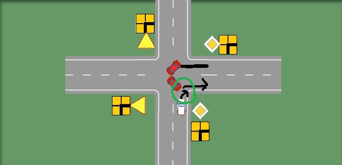 ...ale droga główną poruszają sie pojazdy więc cierpliwie czekasz aż przejadą (ustępujesz pierwszeństwa pojazdom poruszającym się drogą z pierwszeństwem), stoisz tak sobie i stoisz i w tym momencie z naprzeciwka na drodze podporządkowanej podjeżdża do skrzyżowania pojazd z zamiarem skrętu w prawo,
