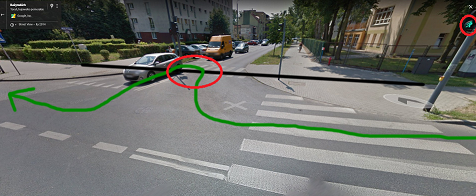 Tutaj nieco bardziej zaawansowany przykład jazdy wzdłuż po przejściu dla pieszych (wjeżdżamy na PdP, i cały czas będąc na nim, pokonujemy całą jego długość, następnie je opuszczając z drugiej strony):