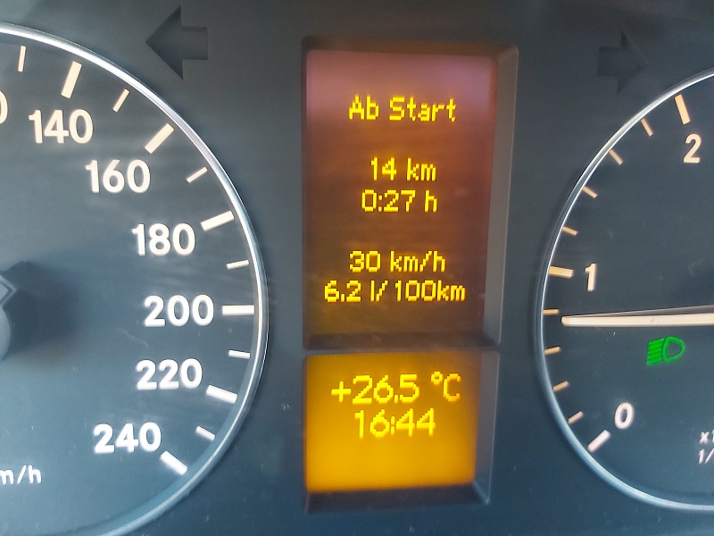 odległość 14km, czas 27 min, średnia prędkość 30km/h, zużycie 6,2l/100km.