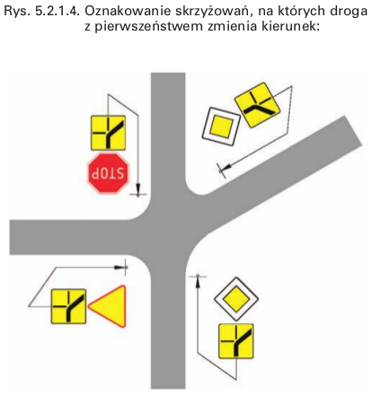 Przykłady oznakowania skrzyżowań, na których droga z pierwszeństwem zmienia kierunek, pokazano na rysunku 5.2.1.4.