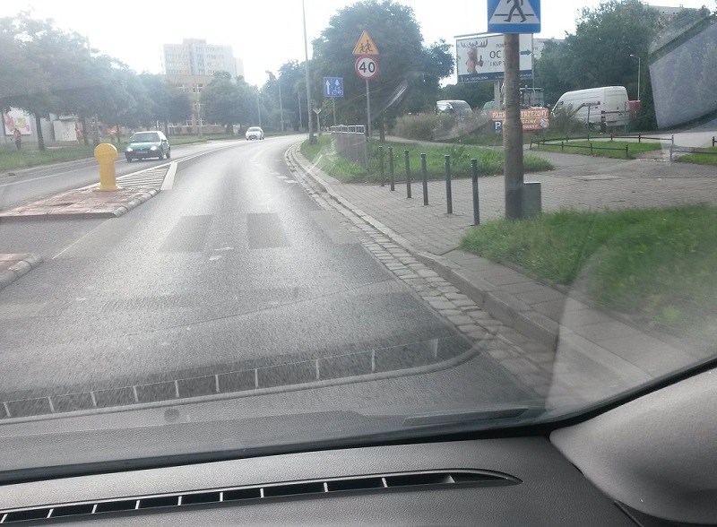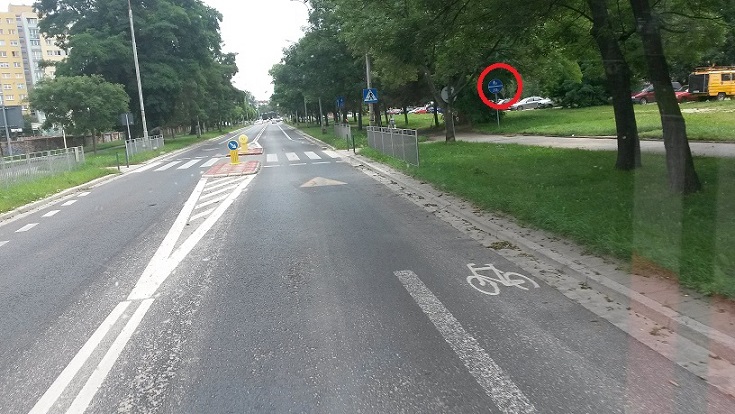 tutaj mam działanie odwrotne, bo za pasem zieleni jest wspólna droga dla pieszych i rowerów, nadal oznaczona znakiem (czerwone kółko). jest tam na tyle szeroko, że można byłoby zrobić nową drogę rowerową poza jezdnią.