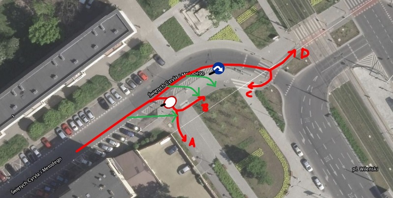 ma wjechać w DdR na powyższym zdjęciu? Warszawa, Cyryla i Metodego. Niestety, na GoogleMAPS brak aktualnej sytuacji...