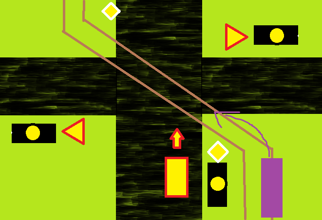 Jak tu jest na tym obrazku? Wiem, brzydko rysuje, ale jakby co to to brązowe to tory, tramwaj to jest to ten taki jakby liliowy, a mój samochód jest czerwono-żółty, mam nadzieję że wszystko jest jasne.