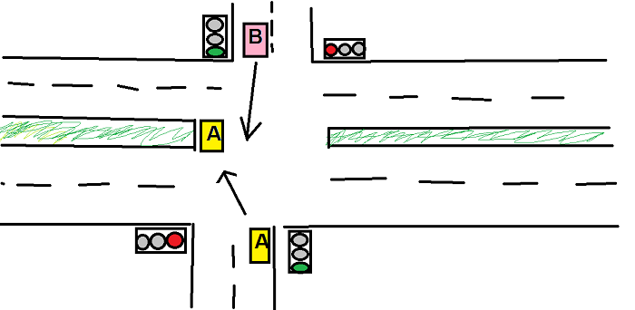 Skrócenie pasa zieleni tworzy na głównej drodze dodatkowy pas ruchu, który nie przecina się z drogą poprzeczną - służy on do zawracania "na krótko". Śmiało możesz z niego skorzystać, o ile nie zajedziesz drogi B, który również ma zielone światło.