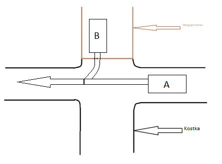 Mam skrzyżowanie na osiedlu domków jednorodzinnych oznakowanym na wszystkich wjazdach znakiem drogowym D40 "Strefa zamieszkania". Skrzyżowanie to wygląda jak na załączniku jedna odnoga jest drogą... i tu pojawia się pierwsze pytanie jaką? Gruntową czy twardą (droga póki co jest utwardzona z tłucznia, w przyszłości będzie wyłożona kostką lub asfaltem). Droga ta jak cała reszta dróg na osiedlu jest drogą wewnętrzną służącą do dojazdu do kilku posesji. Póki co jest w takim stanie, gdyż jest to nowa droga, powstała niedawno, przy której budują się kolejne domy na osiedlu. Na skrzyżowaniu nie ma żadnych znaków informujących o pierwszeństwie, gdyż jak pisałem znajdujemy się w strefie. Na zdjęciu jestem samochodem B, skręcającym w prawo. Z mojej lewej strony jadą samochody A (one mają mnie po swojej prawej stronie). I tu moje pytanie kto ma pierwszeństwo na tym skrzyżowaniu?