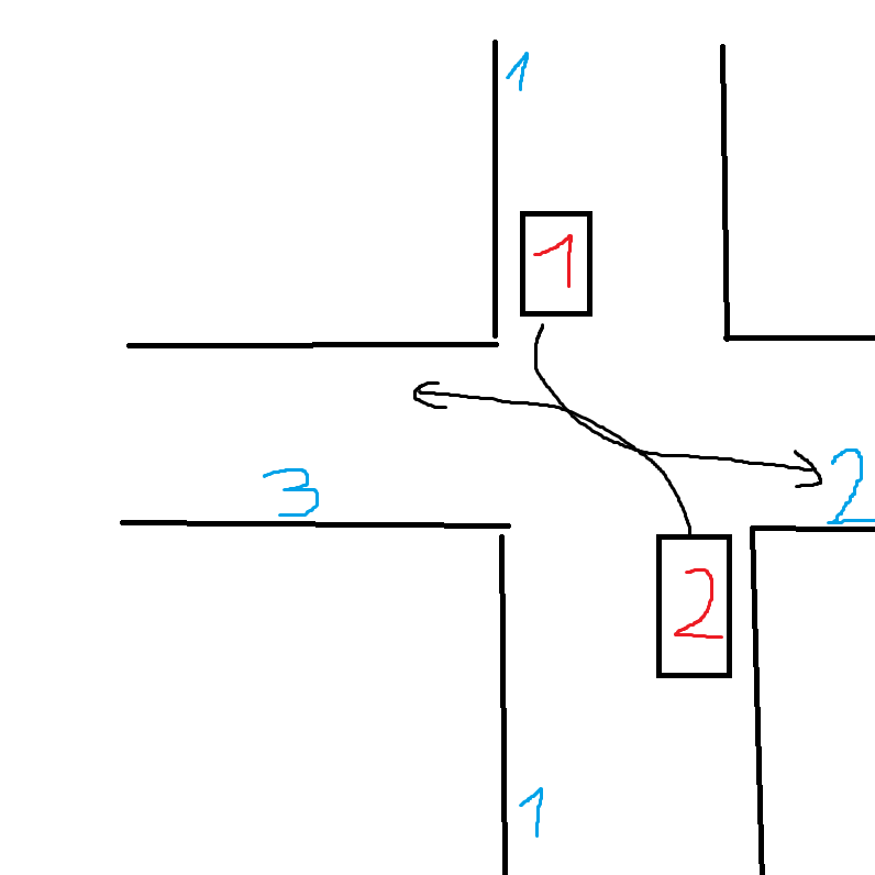 Samochód nr 1 zamierza skręcić w drogę nr2, natomiast samochód nr 2 w drogę nr 3.