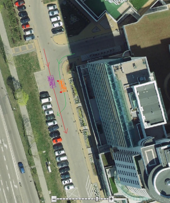 Czy winny jest skręcający na parking kierowca pojazdu pomarańczowgo, który nie spojrzał w lustero i w dodatku skręcał na miejsce parkingowe z dość dużym łukiem, czy może kierowca pojazdu czerwonego, która - bądź co badź - na jednokierunkowej, jednopasmowej drodze wymija z prawej.