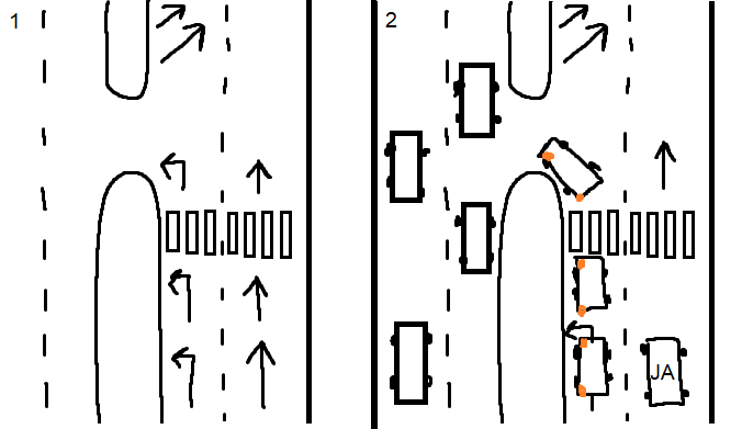 Mam problem przy sytuacji drogowej, która spotyka mnie codziennie. Otóż jak wiadomo przed oraz na przejściu dla pieszych nie można wyprzedzać. Jednak jeżdżę przez drogę na której przejście dla pieszych znajduje się na drodze do skrętu w lewo oraz do jazdy prosto (rys. 1). Często ten lewy pas jest zakorkowany i samochody na nim poruszają się z prędkością 5km/h (dojeżdżają do miejsca w którym mogą skręcić w lewo - rys. 2.). Co powinienem zrobić w takiej sytuacji jadąc prawym pasem? Jest jakieś wyłączenie od przepisu, który przytoczyłem wcześniej w takim przypadku? Przecież nie zwolnię do prędkości pojazdów z lewego pasa i nie zakorkuje przejazdu prosto... Dodam, że jest to droga w terenie niezabudowanym, więc nawet jadąc 80 km/h zazwyczaj mam poganiacza 10 m za sobą i ilekroć postanowiłem zwolnić do tych 10km/h musiałem gwałtowanie przyśpieszyć, bo miałbym go w swoim bagażniku, a o sygnałach dźwiękowych nawet nie wspomnę. Widoczność tam jest dobra (lekko z górki) + jest to raczej odludzie, więc o ewentualnego pieszego bym się nie bał, ale jednak strach przed mandatem zostaje.