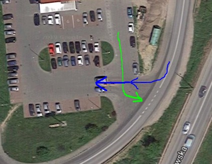 Tak, niebieski chce jechać na wprost po wjeździe na parking.