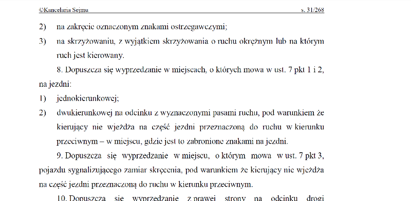 Stanowi o tym art. 24 ust. 10 Ustawy Prawo o ruchu drogowym: "Dopuszcza się wyprzedzanie z prawej strony na odcinku drogi z wyznaczonymi pasami ruchu. A zatem tam, gdzie pasy nie są wyznaczone, wyprzedzać z prawej strony nie wolno."