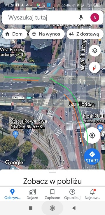 Jechałam zawsze z pomarańczowego na pomarańczowy na wprost bo tak mnie de fakto prowadziły linie przerywane . Będąc pierwsza przyspieszyłam aby unikać przepychanek. Może ja się mylę i mam ustąpić pierwszeństwa tym z zielonego pasa (mam się zatrzymać i poczekać) a może w razie kolizji to ci z zielonego będą winni?