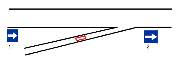 Jezdnia jednopasmowa jednokierunkowa,łączy się z drugą wielopasmową jezdnią jednokierunkową.Przed takim skrzyżowaniem postawiony jest-nie wiedzieć czemu-zakaz skrętu w lewo.