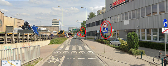 jadąc pojazdem, który zaznaczyłem jako czerwony widzisz tylko znak nr 2, ale nie widzisz znaku nr 1, który jest ustawiony wcześniej (w tym wypadku gdzieś przy wyjeździe z parkingu przed ogródkami działkowymi Oświata), więc nie wiesz, czy ten odcinek drogi jest jedno czy dwukierunkowy.