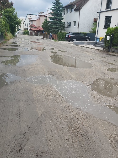 ulica jest strefą zamieszkania i nie ma nawierzchni, a tu takie znaki ostrzegające przed progami zwalniającymi w dwóch miejscach.