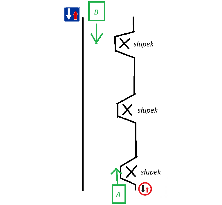 Ja uznawałem, że owszem wjechałem jako 'drugi' na odcinek pomiędzy znakami D5 oraz B31 ale to nadal ja mam pierwszeństwo na tym odcinku drogi, bo znaki tak mówią (wg mnie znaki mówią kto na tym odcinku ma pierwszeństwo bez względu kto pierwszy wjedzie, a nie 'kto wjedzie pierwszy ten ma pierwszeństwo'). I jeśli ma możliwość zjechania pomiędzy słupkami to powinien to zrobić, bo to on ma mi ustąpić pierwszeństwa zgodnie ze znakami.