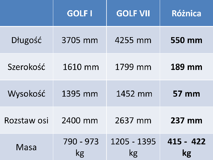 wystarczy porównać sobie samochó VW Golf I, który ważył 790 - 973 kg z Golfem VII o wadze 1205 - 1395 kg.