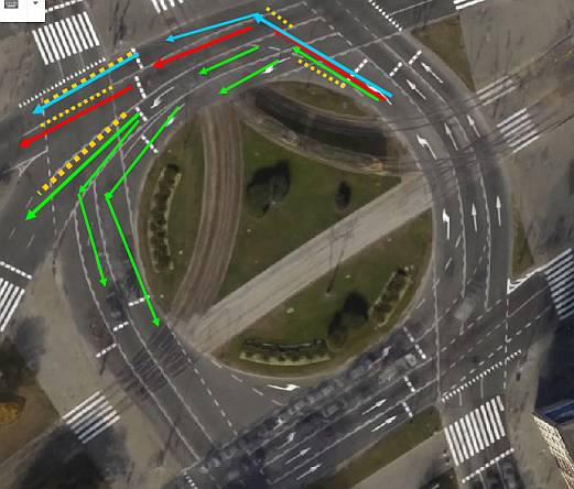 Wybór pasa zachodzi tak jak od samego początku twierdzę tylko i wyłącznie w sytuacji jak zielone strzałki pokazują na rysunku poniżej, a zmiana pasa ruchu już wychodzi tak jak narysowałem czerwoną linię, auto wjeżdża na pas lewy skrajny i dalal wykonując zmianę kierunku jazdy wykonuje manewr zmiany pasa ruchu bo to nie mozna nazwać wyborem pasa i cięcie pasów na hura tak jak dwóch tu wmawia że tak jest, przecież równie dobrze takie cięcie pasów i tłumaczenie że ja nie zmieniałem pasa tylko "wybierałem" w trakcie manewru zmiany kierunku jazdy można by było robić przez całe rondo tak jak niebieską linią narysowałem i co wjeżdżając na ostatni pas i w razie kolizji tez się bedą tłumaczyć że to zmiana kierunku jazdy była a nie pasa ruchu a auto które po tym pasie od dobrej minuty jechało prosto dostało strzała od przecinającego pasy? przecież to głupota jest.