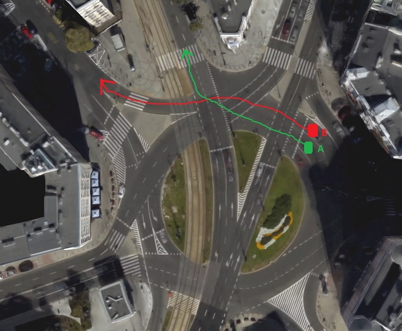 Bardzo proszę o pomoc, to dylemat dla wielu warszawskich kierowców jadących przez plac unii. Czy w danej sytuacji pierwszeństwo ma zielony (A), czy może czerwony (B)?