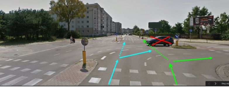 Tu mamy pierwszeństwo łamane, dwa pasy i dwa pojazdy: każdy z nich może kontynuować jazdę swoim pasem ruchu, albo pojechać na wprost.