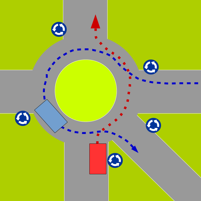 Tak się zastanawiam, który ze znaków ostrzegawczych byłby najodpowiedniejszy dla tego typu skrzyżowania, A-5 czy A-6c. Jeśli skrzyżowanie o ruchu okrężnym jest zwykłym skrzyżowaniem, (patrz wypowiedź szefa Word Kielce) to co stoi na przeszkodzie tak go oznakować Jeśli to jest najnormalniejsze skrzyżowanie to pojazd niebieski na skrzyżowaniu był pierwszy i on ma pierwszeństwo.