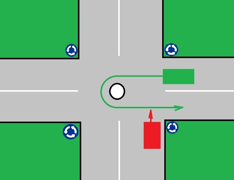 pojazd jedzie prosto, a w miejscu zmiany kierunku jazdy "puszcza" pojazd jadący prosto (oba pojazdy zachowują się identycznie