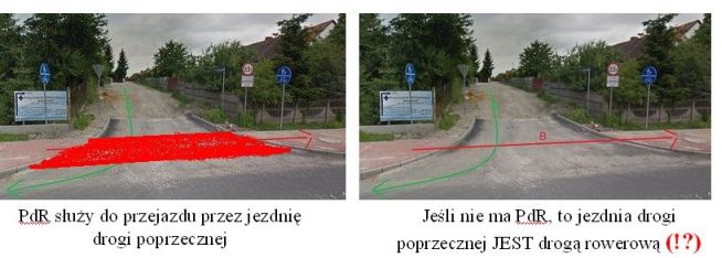 Ot, i całą wasza logika. Jak jest przejazd dla rowerów, to biegnie on przez drogę poprzeczną. Ale jak nie ma przejazdu, to i nie ma drogi poprzecznej, bo czary – mary, zamieniła się w kontynuację DdR. I to wszystko za sprawą C13a!
