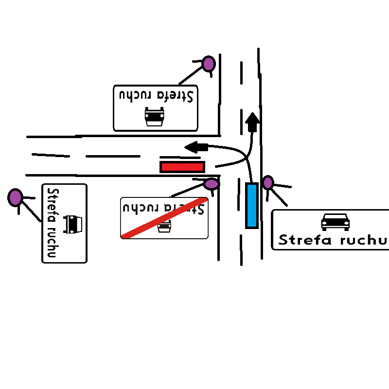 Chętnie pomogę, ale nie rozumiem rysunku ani sytuacji drogowej. Nie widać parkingu, wygląda na to że pierwszeństwo ma niebieski.