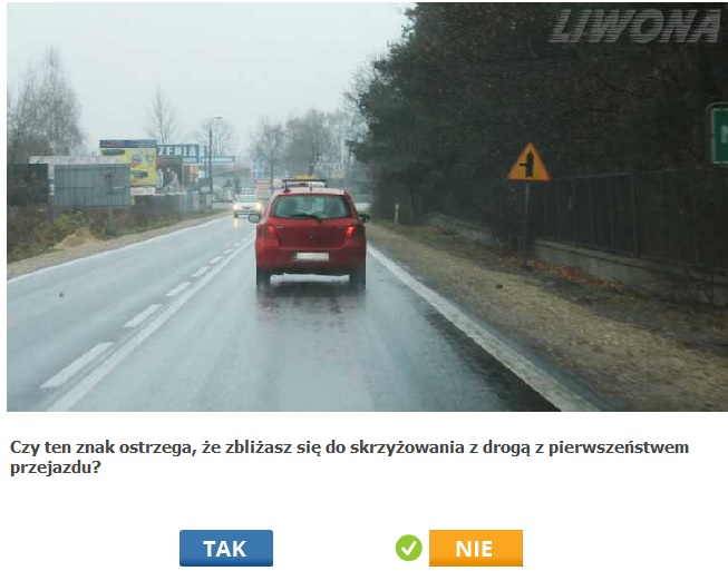 Pamietam jeszcze pytanie,ale nie zrobilam zrzutu,w ktorym jest sie pare metrow przed znakiem "droga z pierwszenstwem". Pytanie brzmi "Czy w tej sytuacji zblizszasz sie do drogi z pierwszenstwem?" i odpowiedz brzmi "nie"