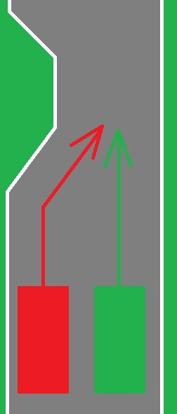 Z czego to wynika? Każdy jedzie swoim pasem, jeśli pas się kończy (jak jest prosta droga to raczej widać to z daleka), a kierowca nie zdążył zmienić pasa, to zatrzymuje się przed jego końcem i zmienia pas gdy będzie wolne. Tak zrobi niebieski jeśli nie uda mu się w ruchu wjechać za czerwony (wyprzedzać nie może). Czerwony i zielony jadą dalej prosto, ale zakładając, że droga się zwęża do "1,5 pasa" i możliwa jest jazda obok siebie, ale odległości między sąsiadującymi pojazdami nie są zbyt bezpieczne, wtedy zielony kulturalnie ustępuje czerwonemu. Wiele jest takich sytuacji w Niemczech, tak tam ludzie jeżdżą i całkiem nieźle to działa. W Polsce stawia się A12-C i też jest wszystko jasne. Taka polska szkoła drogownictwa,
