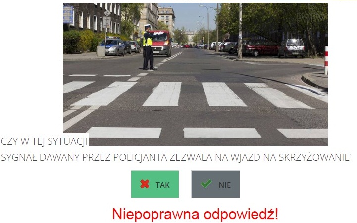 Czy ktoś mi może wyjaśnić dlaczego w tej sytuacji nie mogę wjechać na skrzyżowanie ? Chodzi o to że policjant ma wyciągnięte obie dłonie ? Czy jest to błąd w teście?