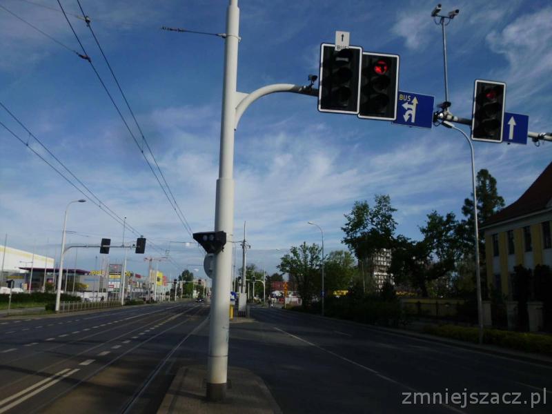 nad lewym pasem sygnalizator dla pojazdów i dla autobusów, po lewej simens dla tramwajów