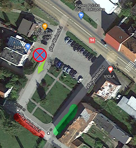 Sytuacja jak w załączniku - plac typu "mały rynek", zaraz za końcem parkingu dla osobówek stoi zakaz zatrzymywania się po prawej stronie, a kilka(naście) metrów dalej jest oznakowana wiata przystankowa. Czego nie widać, to jeszcze droga jednokierunkowa odchodząca "w dół na prawo" od skrzyżowania strefy zielonej i czerwonej. Wszystkie drogi są utwardzone i mają ponad 20 metrów długości.