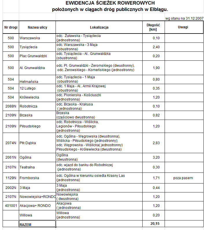 - na samym terenie miasta jest sieć dróg dla rowerów (21 km w 2007), oczywiście mogłoby być więcej, ale nie wydaje się, aby Elbląg odstawał od innych miast.