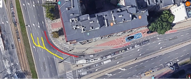 Chyba sytuacja jest taka sama po skręcie z Goworka w Puławską gdzie według Dworaka, taki tor jazdy jest prawidłowy.