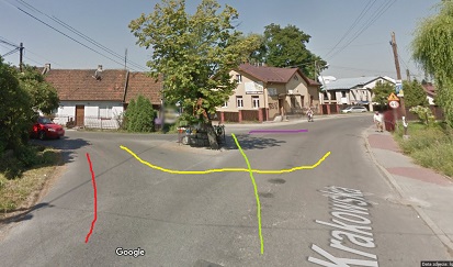 To samo skrzyżowanie: widok z drogi z pierwszeństwem przejazdu (od strony Krakowa)