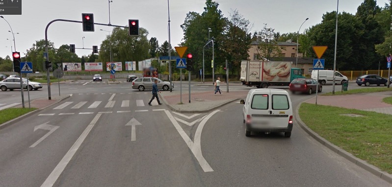 Zwróćcie uwagę, że linia zatrzymania (jeśli jest przed przejściem?), nie pozwala na obserwację sygnalizatora.